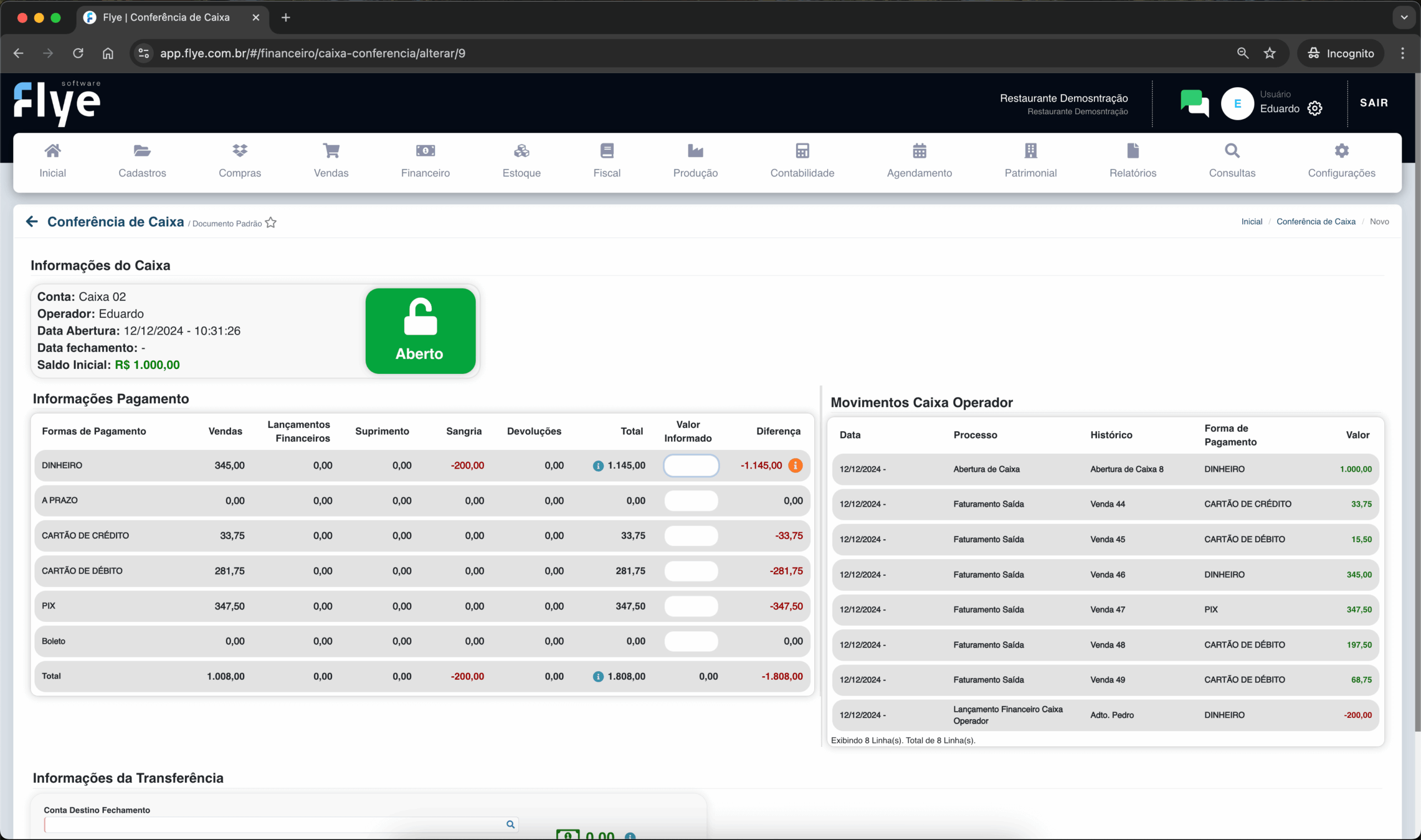 Posteriormente o gerente ou responsável confere o caixa, com o valor informado x do sistema, e realiza o fechamento do caixa após conferência.